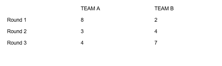 In the case that teams play all 3 rounds in a match, only the two highest point ranking rounds are counted for each team, and is collated and added to their overall scoring for the end of the competitive season. For Example, Team A vs Team B.